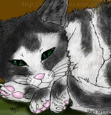 | 1) Черно-белая кошка с жёлтыми глазами. Крепкое, но в тоже время элегантное телосложение. Острые зубы и когти, которыми она с лёгкостью может вспароть живот или разодрать добычу. Она среднего роста. Очень хорошо слышит. Когда она спит, то выглядит очень мило, а стоит ей проснуться сразу же становится настоящей лесной кошкой. У неё чёрный носик. Мускулистая кошка.Быстро бегает из-за её мускулистых и сильных ног. её ушки украшают белые кисточки. 2) Племя Грозового Ветра 3)Чаще всего она строгая, но к котятам, королевам, предводителям и старейшинам она относится мягко и с почтением. Очень разочарована в матери, так как та в свою очередь не удиляла ей внимания и бросила, когда Желтоглазка былы маленькой. Злится на себя , когда считает себя в чем-то виноватой. Она не пожалеет себя ради родного племени. К врагам она беспощадна. отдаст всё ради того, чтобы быть в родимом племени.